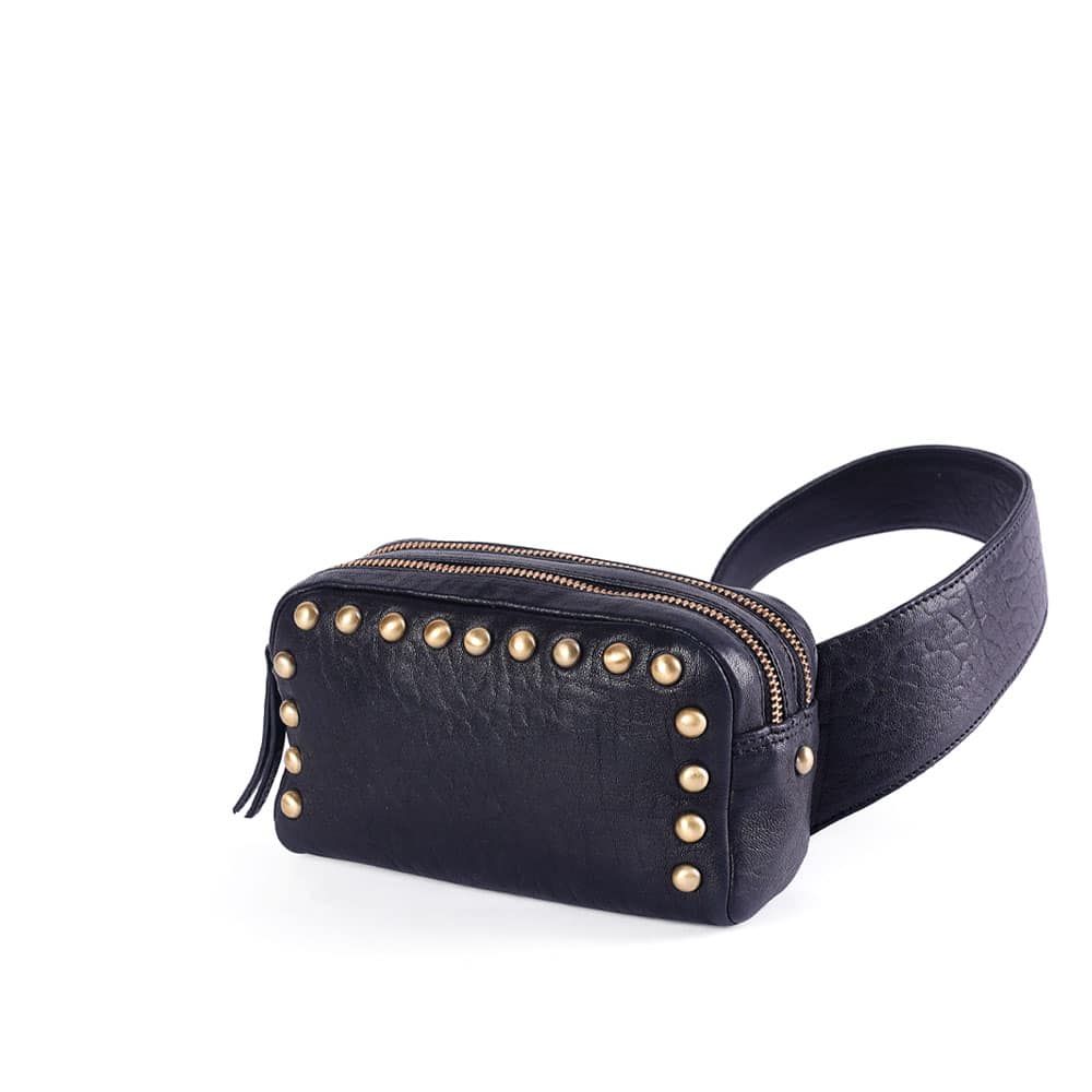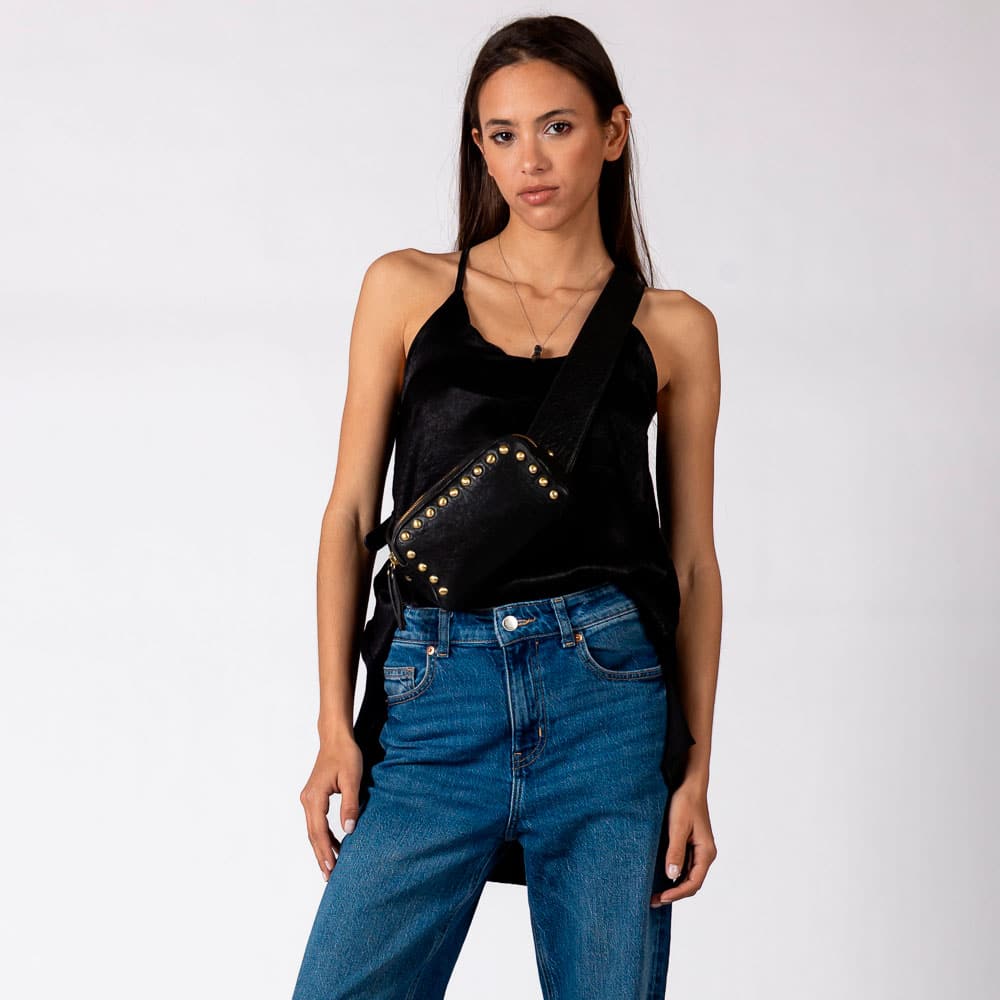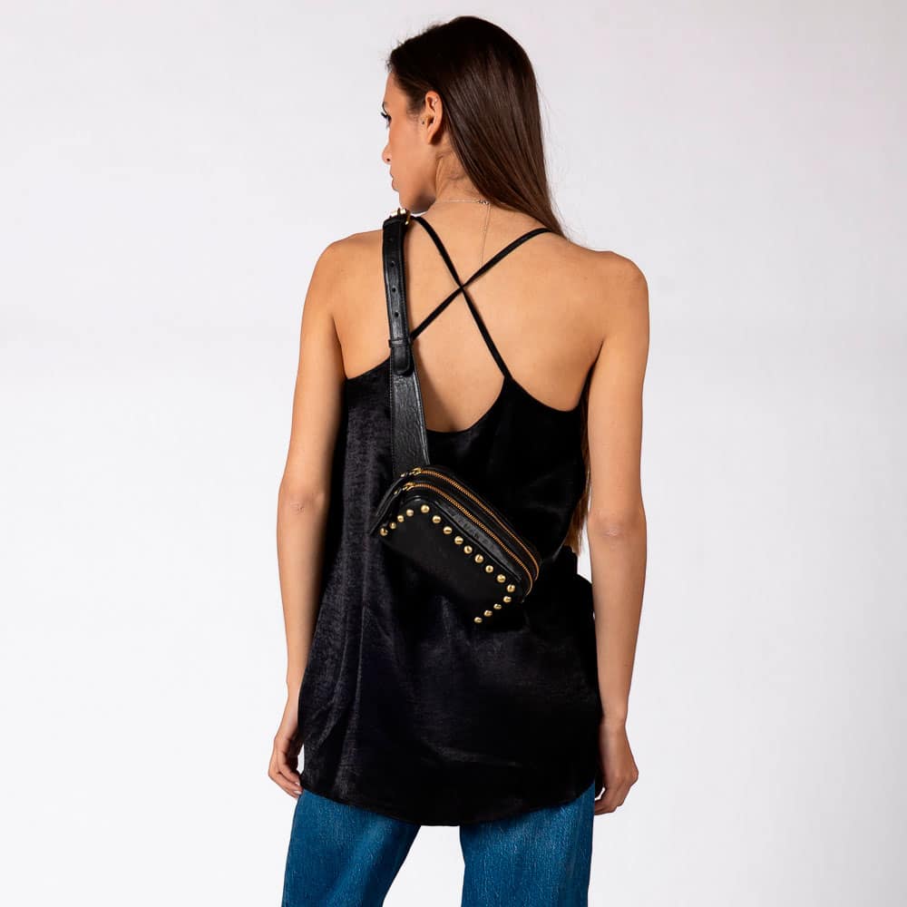 Avec ses détails cloutés qui encadrent la face avant et sa bandoulière plein cuir réglable , il affirme son esprit Rock’n Chic.