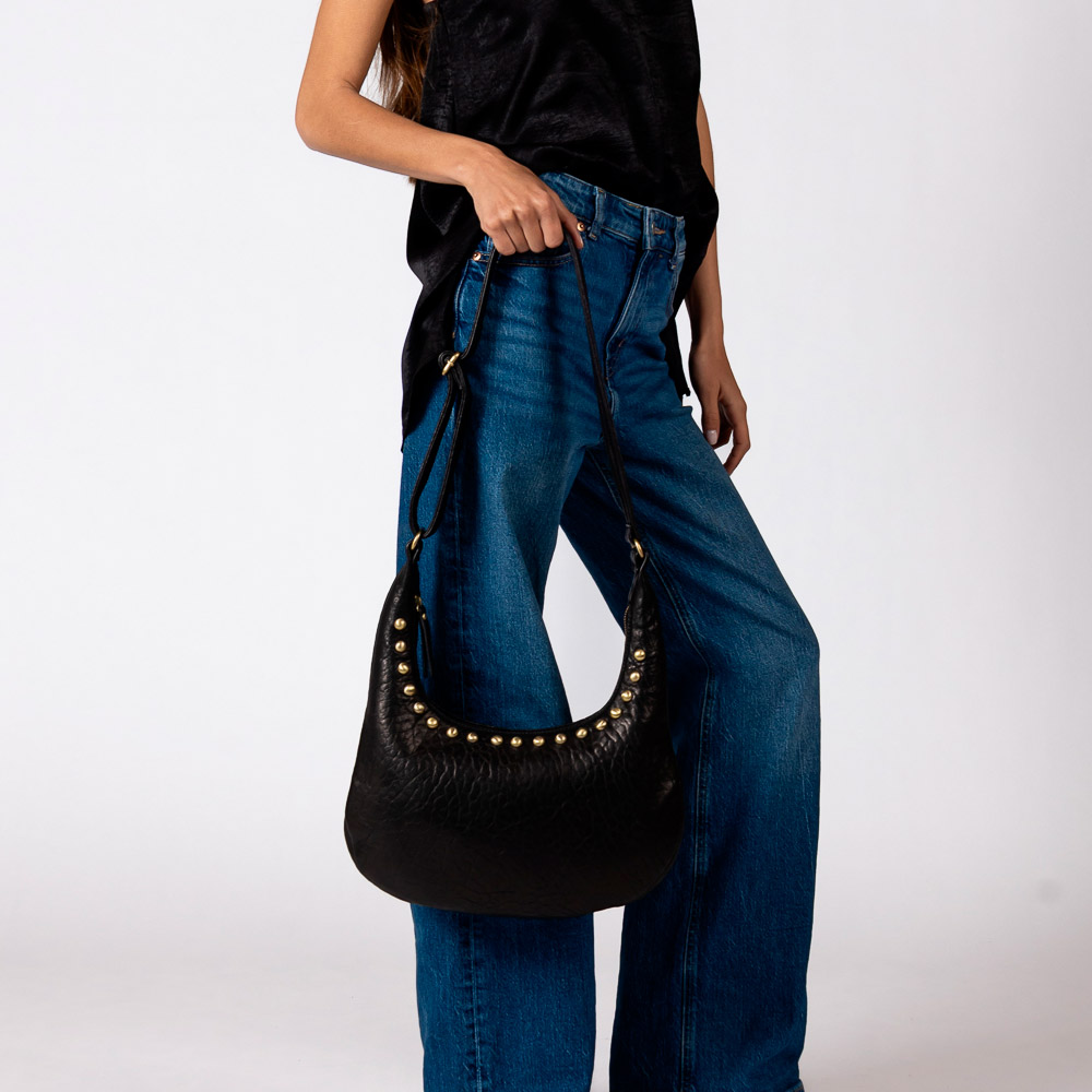 La Soft Bag Moon Noir est une nouveauté de la saison. Un sac lune aux dimensions idéales. Vous pourrez y glisser votre essentiel : portable, cartes, petite monnaie. C’est une VALEUR SÛRE.